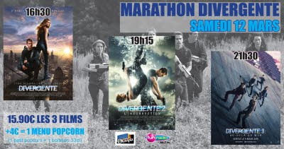 Le film "Divergente" sera diffusé à 16H30, "Divergente 2" à 19H15, et "Divergente 3" à 21H30, vous pourrez aussi bénéficier d'un menu pop corn et d'une boisson !