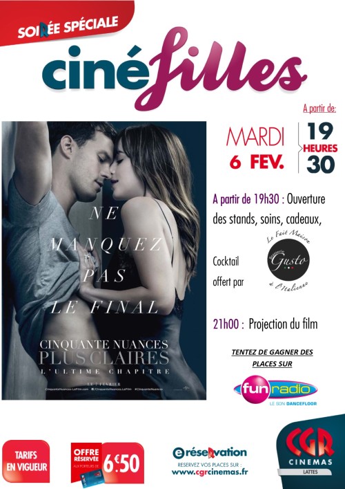 Pour passer une très bonne soirée entre copines, rendez-vous mardi 6 février à partir de 19h30 au CGR de Lattes ! Vous assisterez entre filles à la projection de l'ultime volet des aventures sexy de Mr Grey et Miss Steele "50 nuances plus claires".