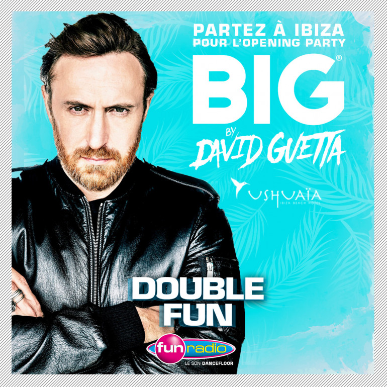 A tout moment de la journée, dès que vous entendez le Double Fun avec deux titres de David Guetta, soyez les premiers à appeler Fun Radio au 3228 et vous partez à Ibiza pour assister à son opening à l'Ushuaia.