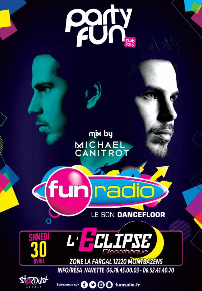 Fun Radio présente la soirée Party Fun Club à l'Eclipse Discothèque à Montbazens dans l'Aveyron ! Samedi 30 avril, venez faire la fête sur le meilleur du son dance-floor avec le DJ Fun Radio Michael Canitrot qui vous mixera tous les tubes de Party Fun, la première émission Dance/Electro en France le week-end !