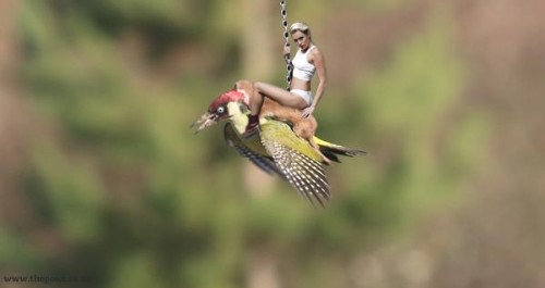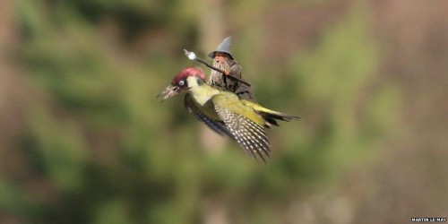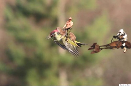 Scène impossible en réalité, Madonna, vêtue de la cape Armani qui a failli causer sa perte aux BRIT Awards, se retrouve à califourchon sur le dos du pivert : D'autres ont pensé au président russe Vladimir Poutine, et sa passion pour les balades torse nu dans la nature sauvage. S'il était de la taille d'un Minimoy, il pourrait tout à fait voler à dos de pivert. Tant qu'à faire, ils ont rajouté un Storm Trooper, qui pourrait lui servir de garde du corps :