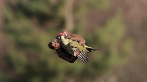 Tout comme pour "l'affaire de la robe", il n'a pas fallu longtemps aux Internets pour s'emparer du buzz du jour : une photo montrant un bébé belette sur le dos d'un oiseau, immortalisée par le Britannique Martin Le-May. Malgré la beauté du tableau, il immortalise une technique de chasse courante chez les rongeurs qui essaient de déstabiliser leur proie. Heureusement, plus de peur que de mal pour le pivert rouge et vert, qui a échappé à son funeste destin : Pour égayer cette scène digne d'un épisode de Chasse et Pêche, les internautes ont décidé de détourner cette photo de différentes façons, la transformant alors en mème. Ils se sont surtout amusés à rajouter des personnalités sur le dos du pivert attaqué.
