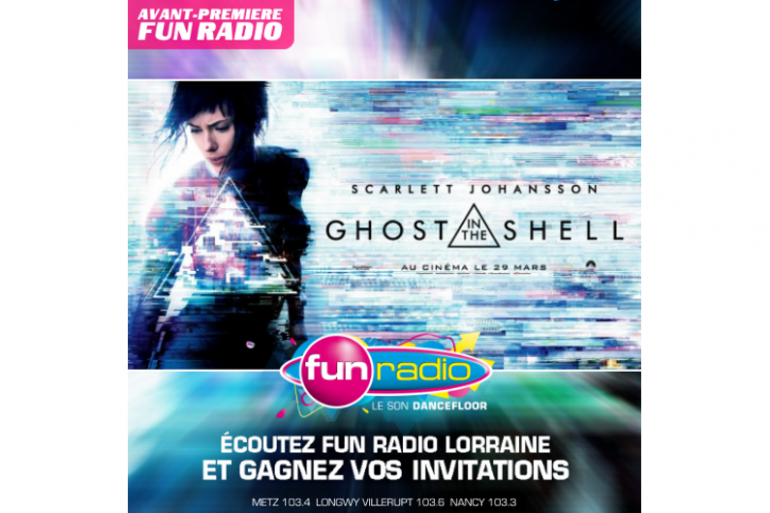 Ecoutez Alex entre Midi & 16h sur FUN RADIO LORRAINE & gagnez vos invitations pour l'avant-première du film Ghost In The Shell, Mardi 28 mars à 19H45 & 22H15, KINEPOLIS Nancy.