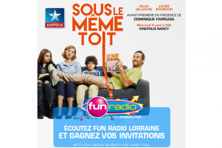 Ecoutez Alex entre Midi & 16h sur FUN RADIO LORRAINE & gagnez vos invitations pour l'avant-première du film SOUS LE MEME TOIT, mercredi 5 avril 2017 à 20h00, dans votre cinéma Kinépolis Nancy. Avec la présence exceptionnelle du réalisateur Dominique Farrugia.
