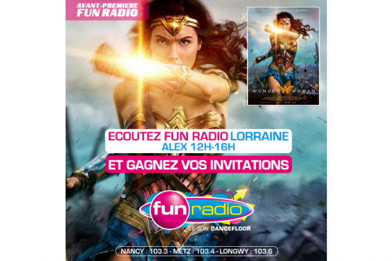 Ecoutez Alex entre Midi & 16h sur FUN RADIO LORRAINE & Gagnez vos invitations pour l'avant-première du film WONDER WOMAN, mardi 6 juin à 20h15 à UGC Ciné Cité Ludres & à 19h45 à Kinépolis Saint-Julien-Les-Metz. Jouez également sur notre page Facebook Facebook/CommunauteFunRadioLorraine > Envoyez un MP avec votre Nom Prénom Age Ville Mail Tél & le Fun'Pass : POUVOIRS