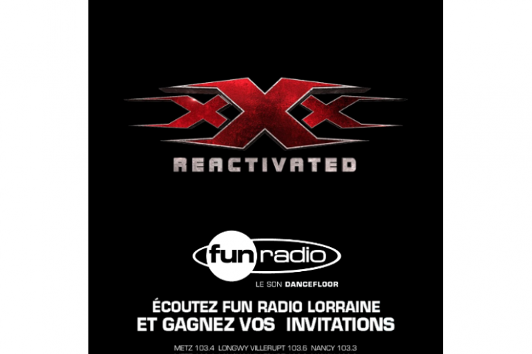 Ecoutez Alex entre midi & 16h sur FUN RADIO LORRAINE & gagnez vos invitations pour l'avant-première du film XXX: REACTIVATED, mardi 17 janvier à 19h45 et 22h15 à Kinépolis-Saint-Julien-Les-Metz, et 19h45 à Kinépolis Nancy.
