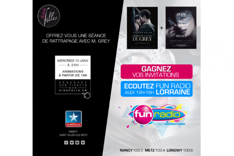 La prochaine soirée filles aura lieu mardi 9 janvier, Kinépolis Nancy & mercredi 10 janvier, KINEPOLIS Saint-Julien-les-Metz, avec la projection de 50 NUANCES DE GREY + 50 NUANCES PLUS SOMBRES. Ecoutez Alex entre Midi & 16h et Gagnez vos invitations. Avec Fun Radio Lorraine.