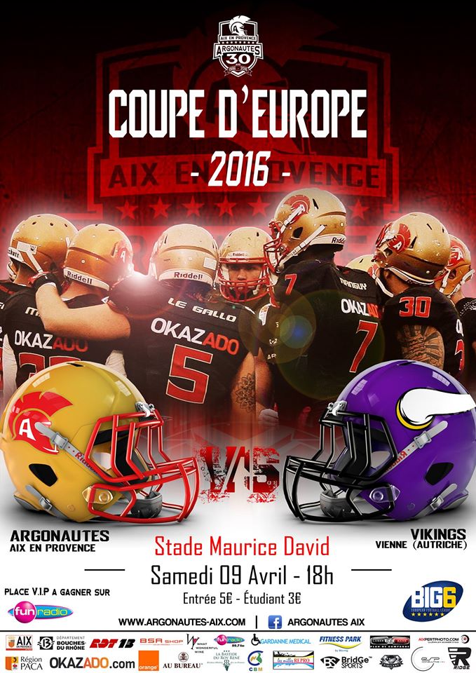 FUN RADIO Marseille vous offre vos pass vip pour le match de coupe d'Europe : Argonautes d'Aix en Provence / Vikings (Autriche) le samedi 9 avril 2016 à 18H au stade Maurice David à Aix en Provence.