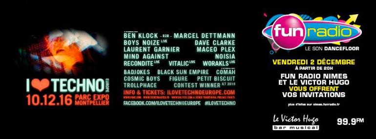 Fun Radio Nîmes et le Victor Hugo vous offrent vos invitations pour le Festival I Love Techno Europe.