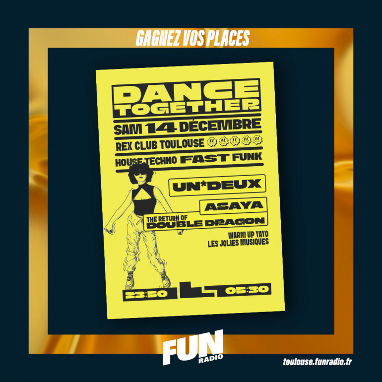 Pour jouer, envoyez un mail à toulouse@funradio.fr avec en objet : "DANCE TOGETHER" et notez votre Prénom, Nom, dresse et numéro de téléphone. Bonne chance avec FUN RADIO TOULOUSE !