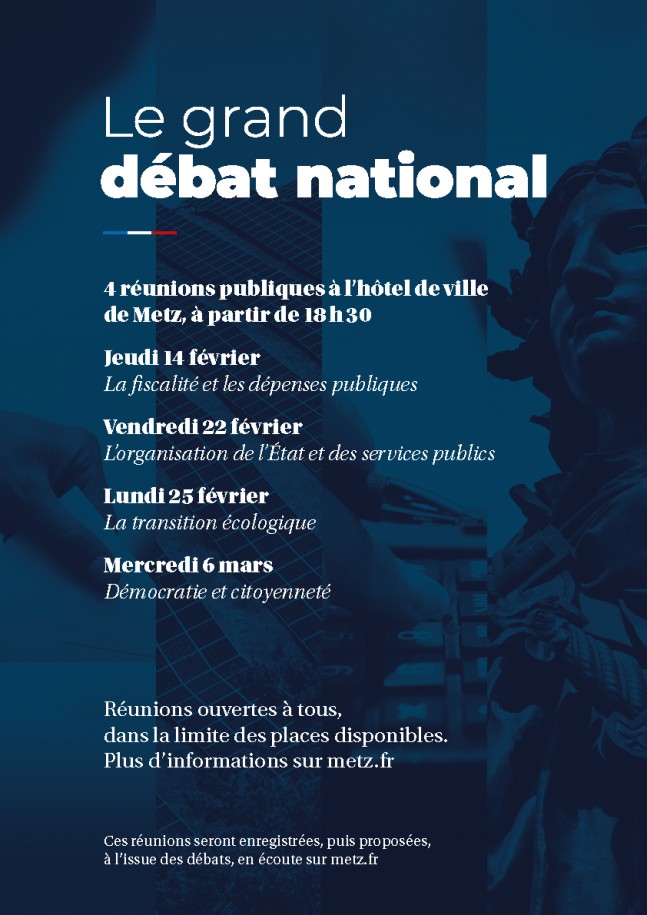 De son côté, Metz s'investit également. La ville organise à partir du mois prochain quatre réunions publiques dans le grand salon de l’hôtel de ville. Elle reprennent les thèmes proposés par le gouvernement. Ces rendez-vous sont ouverts à tous dans la limite des places disponibles. Les discussions seront ensuite mises en ligne sur le site metz.fr. Des cahiers de doléances sont déjà mis en place à l'hôtel de ville et dans les mairies de quartier.