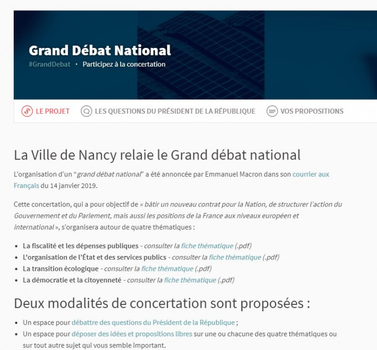 A Nancy, une plateforme de concertation a été lancée sur Internet. La ville a ouvert un espace où les citoyens peuvent débattre des thématiques et des questions posées par Emmanuel Macron à savoir la fiscalité et les dépenses publiques, l'organisation de l'Etat et des services publics, la transition écologique, la démocratie et la citoyenneté. Ils peuvent également déposer des idées et des propositions sur ces catégories ou sur un tout autre sujet.