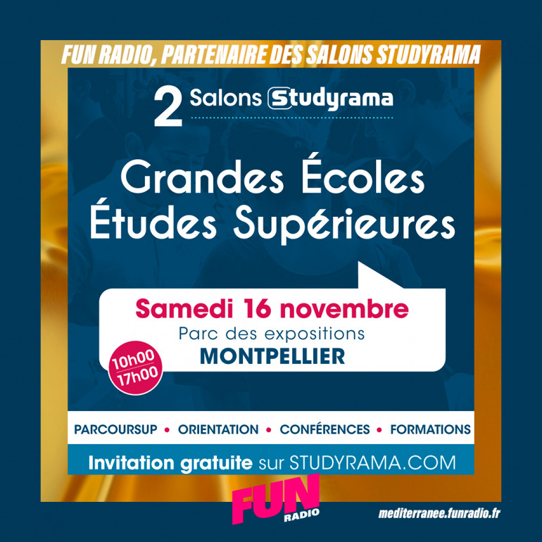 Le salon Studyrama des Etudes Supérieures de Montpellier vous donne rendez-vous avec Fun Radio Méditerranée au Parc des Expositions, le samedi 16 novembre, pour préparer votre futur !