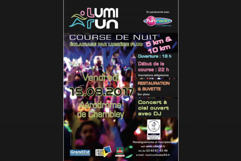 Participez à la course LUMI RUN, organisée par le comité départemental Olympique & Sportif de Meurthe-et-Moselle, en partenariat avec Fun Radio Lorraine. La première plus grande course de nuit de la région, vendredi 15 septembre à Chambley. Lumi Run, c'est 5 km ou 10km de Fun & de plaisir, rythmée par les mix Electro de Fun Radio. Le parcours vous fera traverser 7 univers différents de décorations lumineuses. De nombreuses animations au programme : peintures colorées, traversée de zone à bulles d'eau, zone fumigènes. Pack fluorescent, maquillage & body paint offert à chaque participant. Echauffement & animations dès 18h, course à 22h. Clôture de la Lumi Run avec Matt DJ Fun Radio, qui vous fera vibrer jusqu'au bout de la nuit. Tarif 35 €. Inscription CLIQUEZ-ICI Un événement Fun Radio Lorraine
