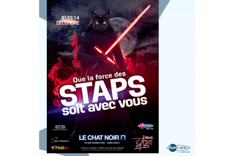 Soirée étudiante "Que la Force des Staps soit avec vous" jeudi 14 décembre 2017 dès 23h30 au CHAT NOIR de Nancy. Choisissez votre camp : Côté obscur ou côté lumineux de la force ? À vous de choisir dès votre arrivée !