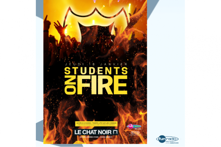 Soirée étudiante STUDENTS ON FIRE, ce jeudi 18 janvier 2018 dès 23h30 au CHAT NOIR de Nancy. Une soirée furieuse et très chaude ! Toutes Facs Toutes Filières. Ambiance explosive sur le Dancefloor !