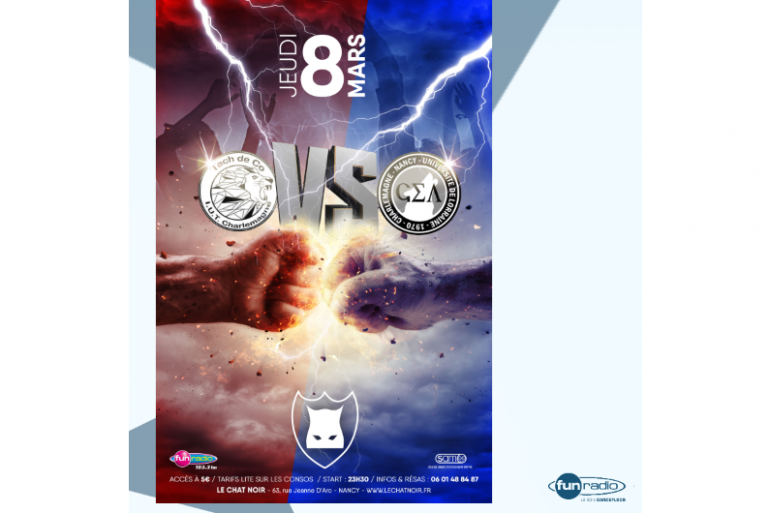 Soirée étudiante  TC vs GEA, ce jeudi 8 mars 2018 dès 23h30 au CHAT NOIR de Nancy.Qui sera l'équipe gagnante ? Choisissez votre camp !. Start à 23h30. Accès à 5€. Infos 06.01.48.84.87. Avec Fun Radio Lorraine.