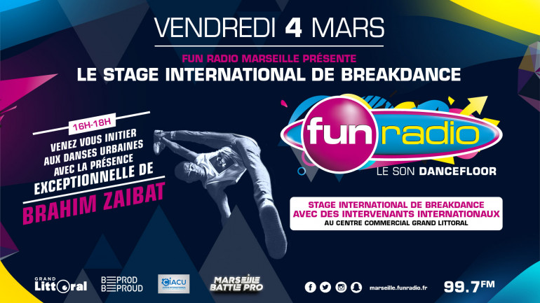 FUN RADIO Marseille présente le Stage international de breakdance (Master Class) vendredi 4 mars dès 16H au Centre Commercial Grand Littoral.
