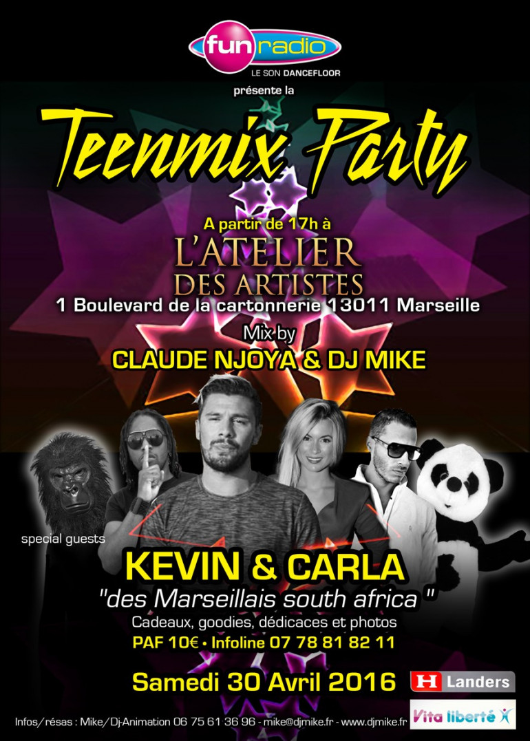 FUN RADIO Marseille présente la Teen Mix Party samedi 30 avril dès 17H à l'Atelier des artistes à marseille avec Claude N'Joya, DJ Mike et aussi Kevin et Carla des marseillais.