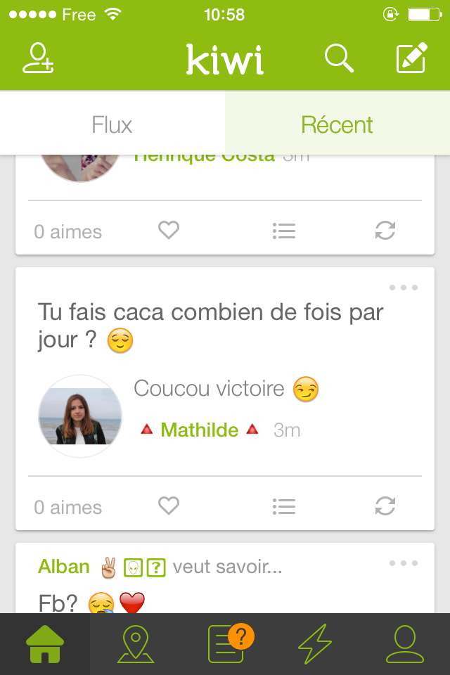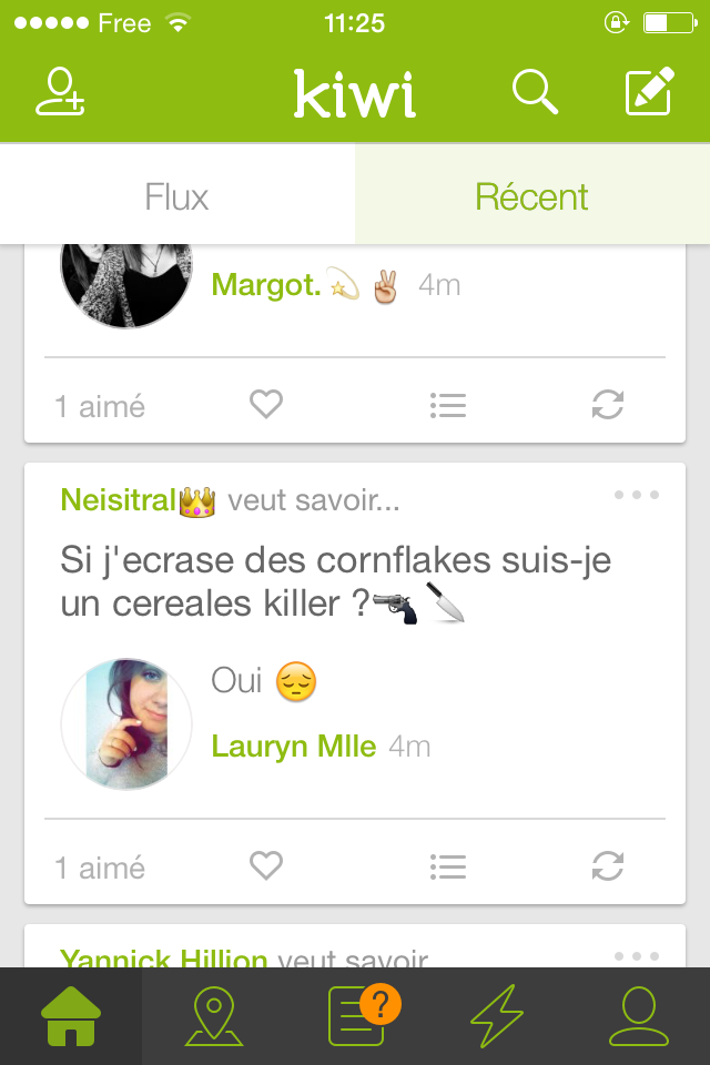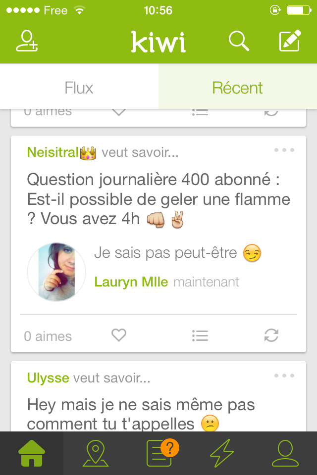 Vous connaissez surement déjà Kiwi. Pour ceux qui seraient passés à côté, il s'agit d'une nouvelle application qui rencontre un certain succès en ce moment. On peut y poser toutes les questions que l'on veut, et les autres utilisateurs y répondent. Soumises à aucun contrôle, les interrogations de certains internautes sont parfois un peu déroutantes, voire, complètement WTF... Petit florilège des postes les plus insolites.
