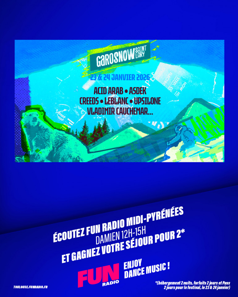 Cette semaine Fun Radio Midi Pyréénes vous offres 1 séjour pour 2 personnes avec hébergement 2 nuits, forfaits valables 2 jours et Pass 2 jours pour le festival, le 23 & 24 janvier