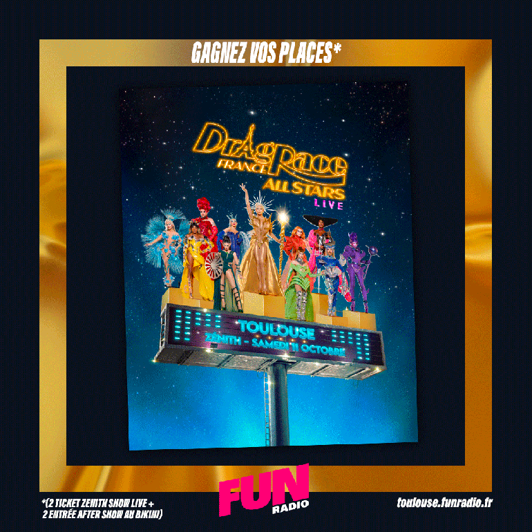 Samedi 11 Octobre venez assister au show L-E-G-E-N-D-A-I-R-E de Drag Race France Live All Star au Zénith de Toulouse avec Bleu Citron ! Mais la soirée ne s'arrête pas la car Fun Radio Midi Pyrénées avec la Gayguette vous offre vos entrées pour l'After Show au Bikini avec la présence de Soa De Muse, Punani et Misty Phoenix !