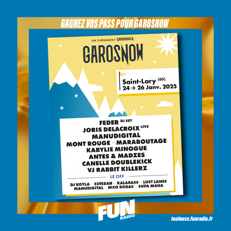 C'est l'évènement de ce début d'année 2025 en Occitanie ! Le festival Garosnow revient pour deux dates en Occitanie : les 10 et 12 janvier à la station des Angles (Pyrénées-Orientales) et du 24 au 26 janvier à la station de Saint-Lary (Hautes-Pyrénées). C'est évidemment avec Fun Radio pour gagnez les dernières places !